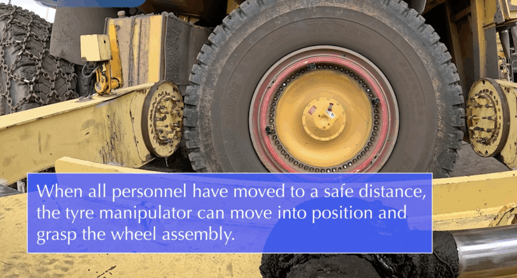 When all personnel have moved to a safe distance, the Tire-manipulator can move into position and grasp the wheel assembly.