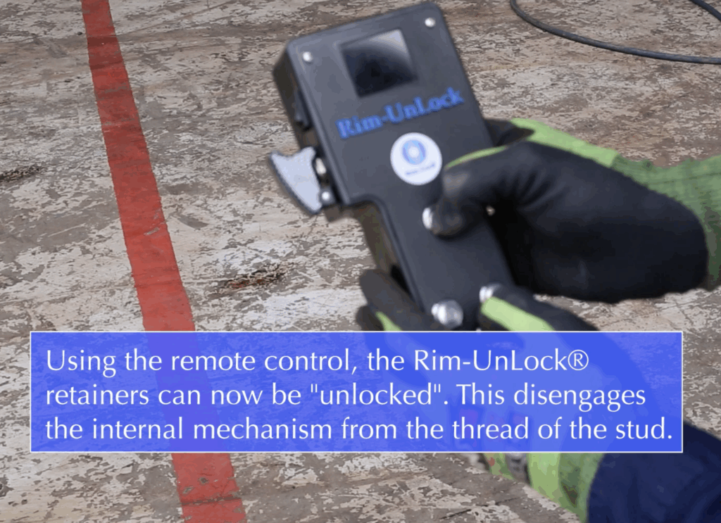 Once the Rim-UnLockĀ® retainers are in place, removal of all remaining wheel nuts can continue as normal. The removal of the final wheel nuts from the wheel assembly creates an unsecured load and becomes a crush zone in which tire fitters are at risk.